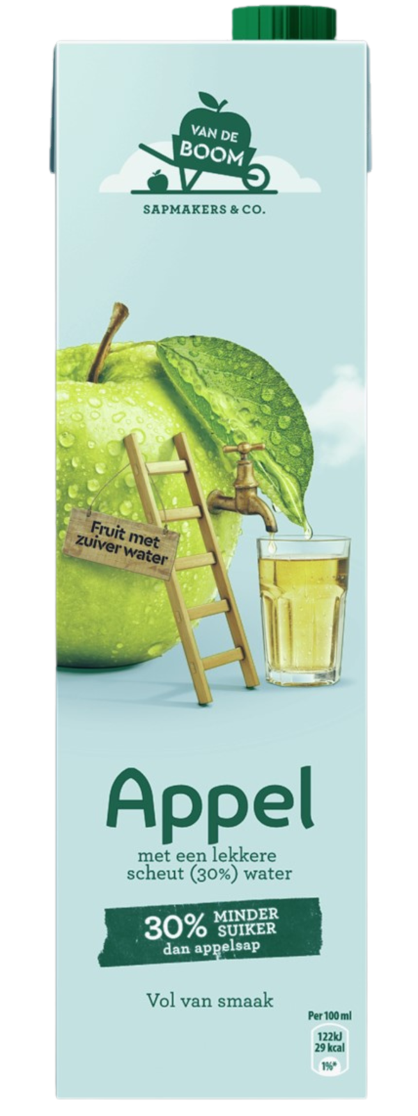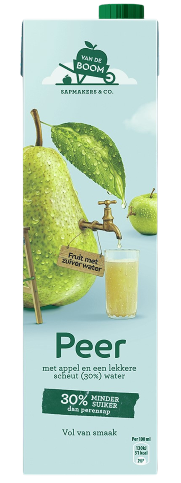 Van de Boom heeft 3 varianten sap; ananas-, appel-, en perensap. Deze sappen bevatten 30% zuiver bronwater. Hierdoor zijn ze heerlijk verfrissend en bevatten ze 30% minder suiker dan reguliere sappen. Een pak van je hart, toch?!