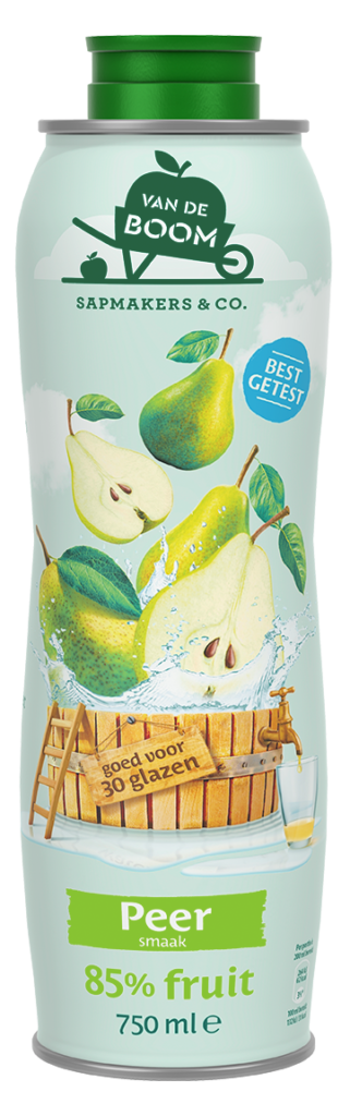Met Van de Boom Peer siroop maak je gemakkelijk een glas heerlijke vruchtenlimonadesiroop mét 85% fruit!